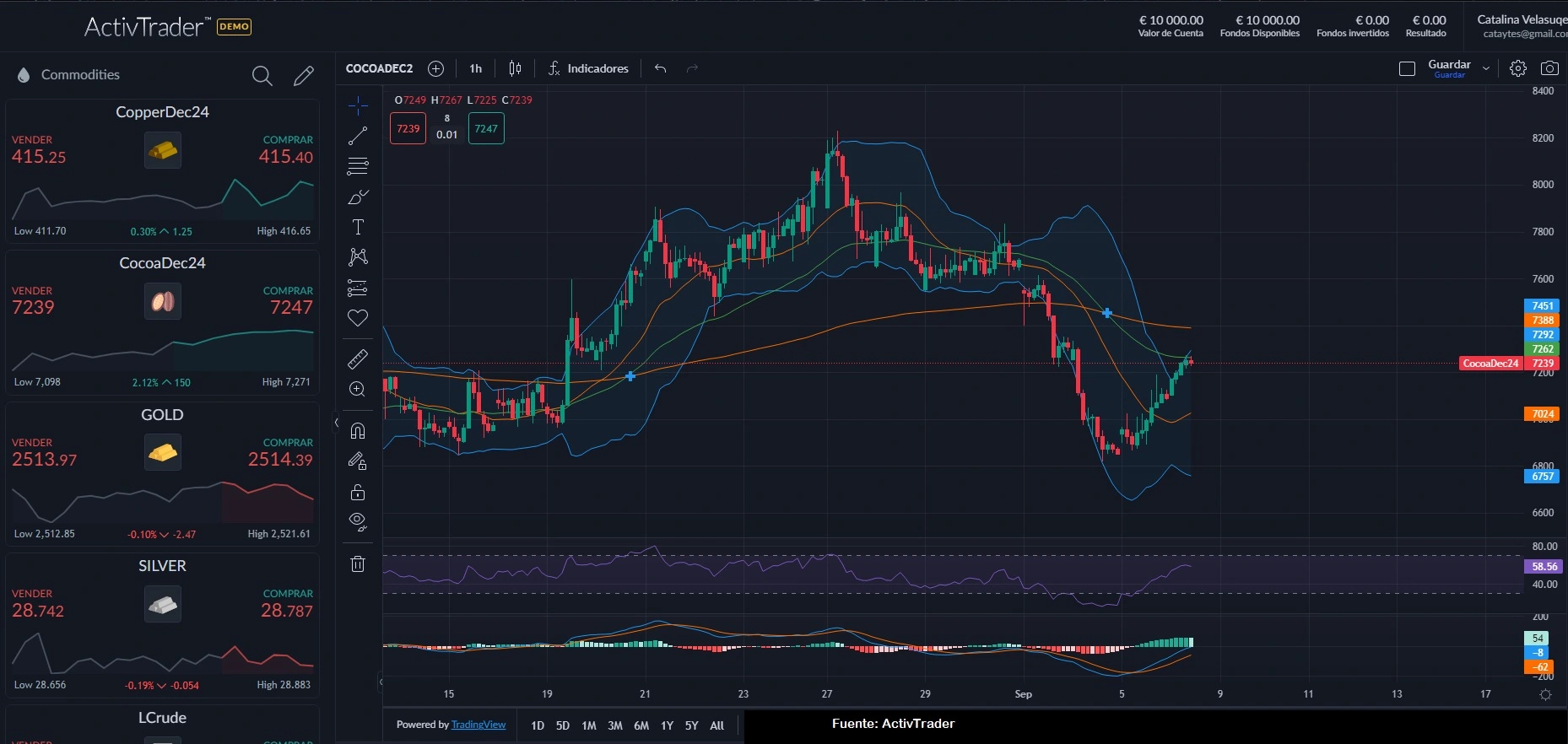 El análisis técnico respalda esta perspectiva. El gráfico de Cocoa Dec24 muestra un patrón de corrección tras la reciente caída en los precios. Tras tocar un soporte clave en torno a los 7,000 puntos, el precio ha comenzado a recuperarse, marcando una serie de velas alcistas que sugieren una reactivación de la tendencia. Esta recuperación coincide con un cruce de las medias móviles de 50 y 200 periodos, lo que refuerza la señal de un posible cambio de tendencia hacia el alza. Este cruce es frecuentemente observado como una señal de compra por muchos analistas técnicos, lo que podría atraer nuevos flujos de capital al mercado.