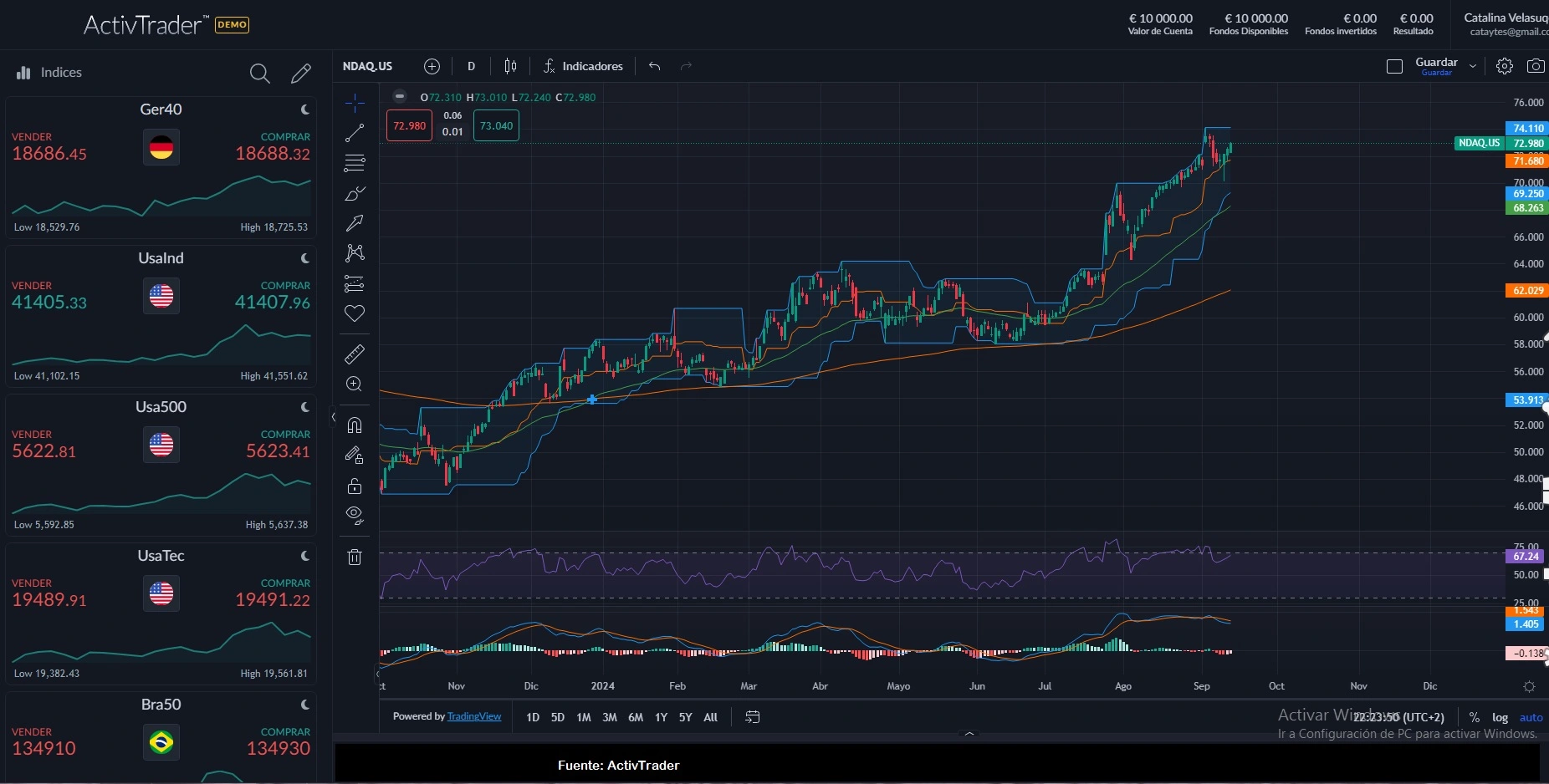 Comentario: El gráfico del Nasdaq muestra una clara tendencia alcista respaldada por una estructura de máximos y mínimos ascendentes, con el precio operando por encima de la media móvil de 200 períodos, lo que refuerza el sentimiento positivo en el mercado. Actualmente, el índice se encuentra cerca de los niveles de 74.110, habiendo superado resistencias clave. El RSI indica una fortaleza en el impulso alcista, aunque se acerca a zonas de sobrecompra. El indicador MACD, por su parte, se encuentra en territorio positivo, lo que respalda la continuidad de la tendencia. A corto plazo, es importante vigilar posibles retrocesos que podrían acercar el precio a niveles de soporte, como los 71.680 o incluso la media móvil de 200 en torno a los 62.029, antes de continuar su ascenso hacia nuevos máximos. Este escenario técnico refuerza la idea de que el Nasdaq podría seguir liderando el crecimiento en el sector tecnológico, pero los inversores deben estar atentos a la volatilidad y posibles correcciones en el camino.